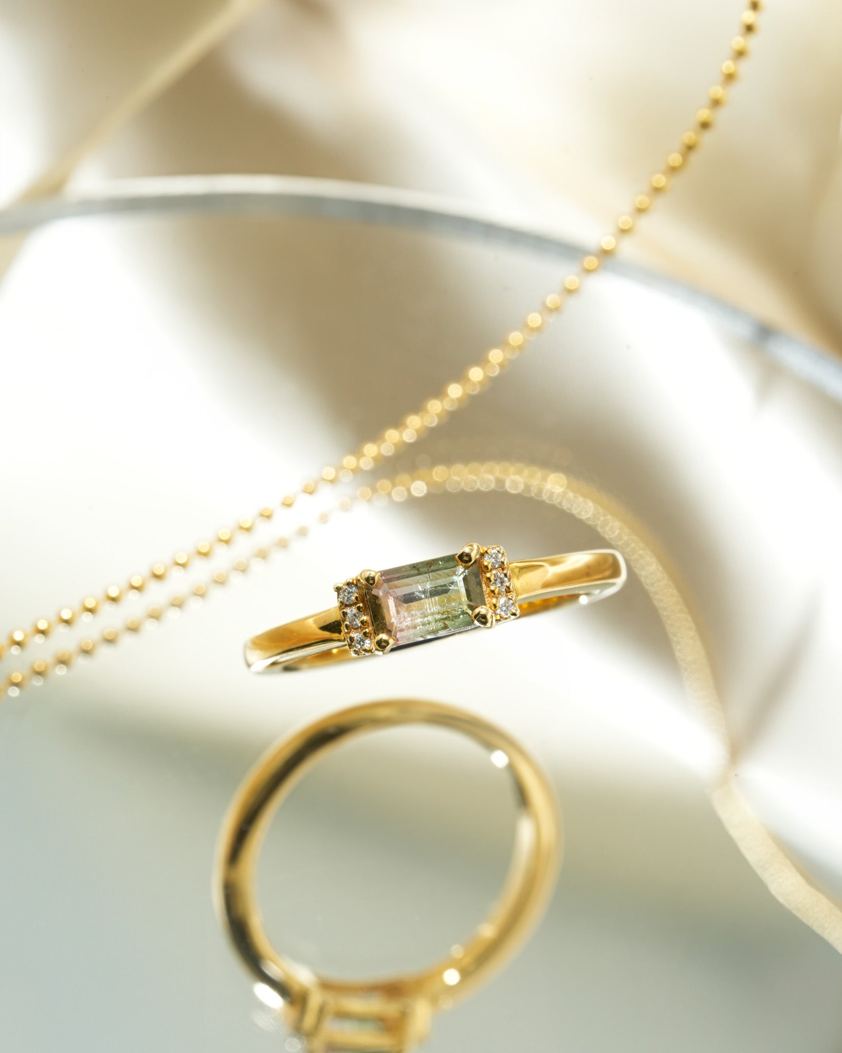 バイカラートルマリンが織りなす、淡く移ろうグラデーションは世界にひとつだけの奇跡。光の加減や角度で表情を変え、見るたびに新しい美しさに出会えます。